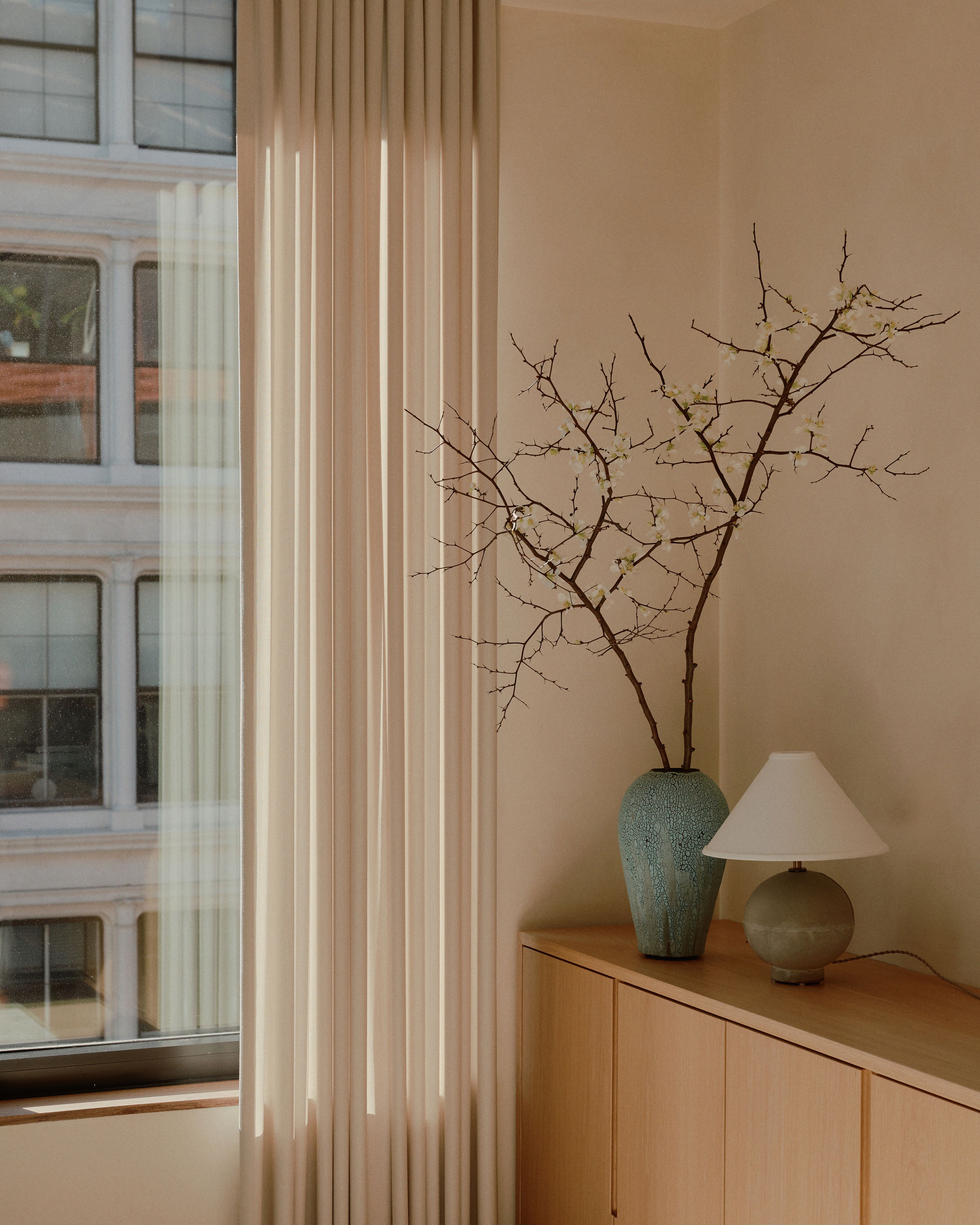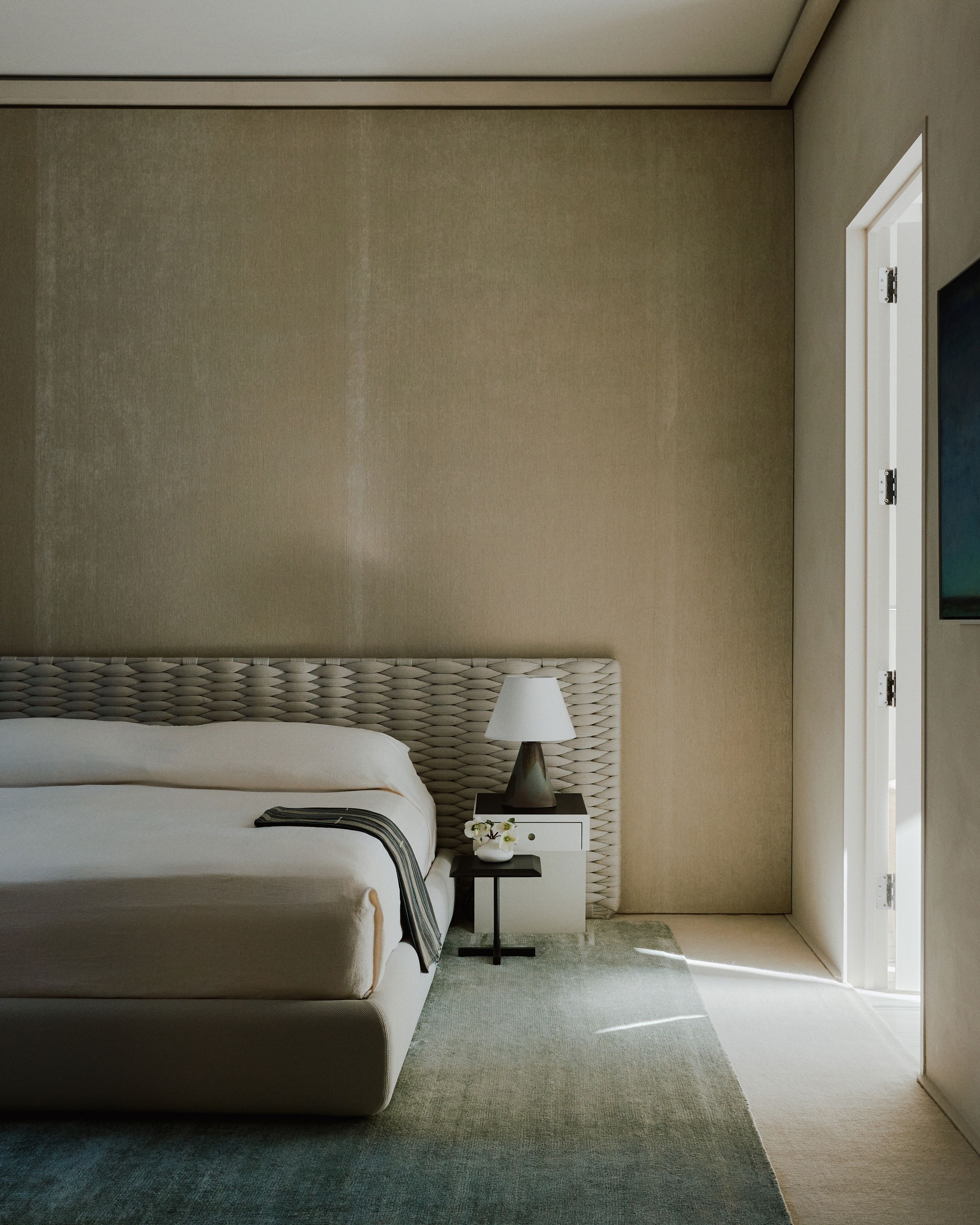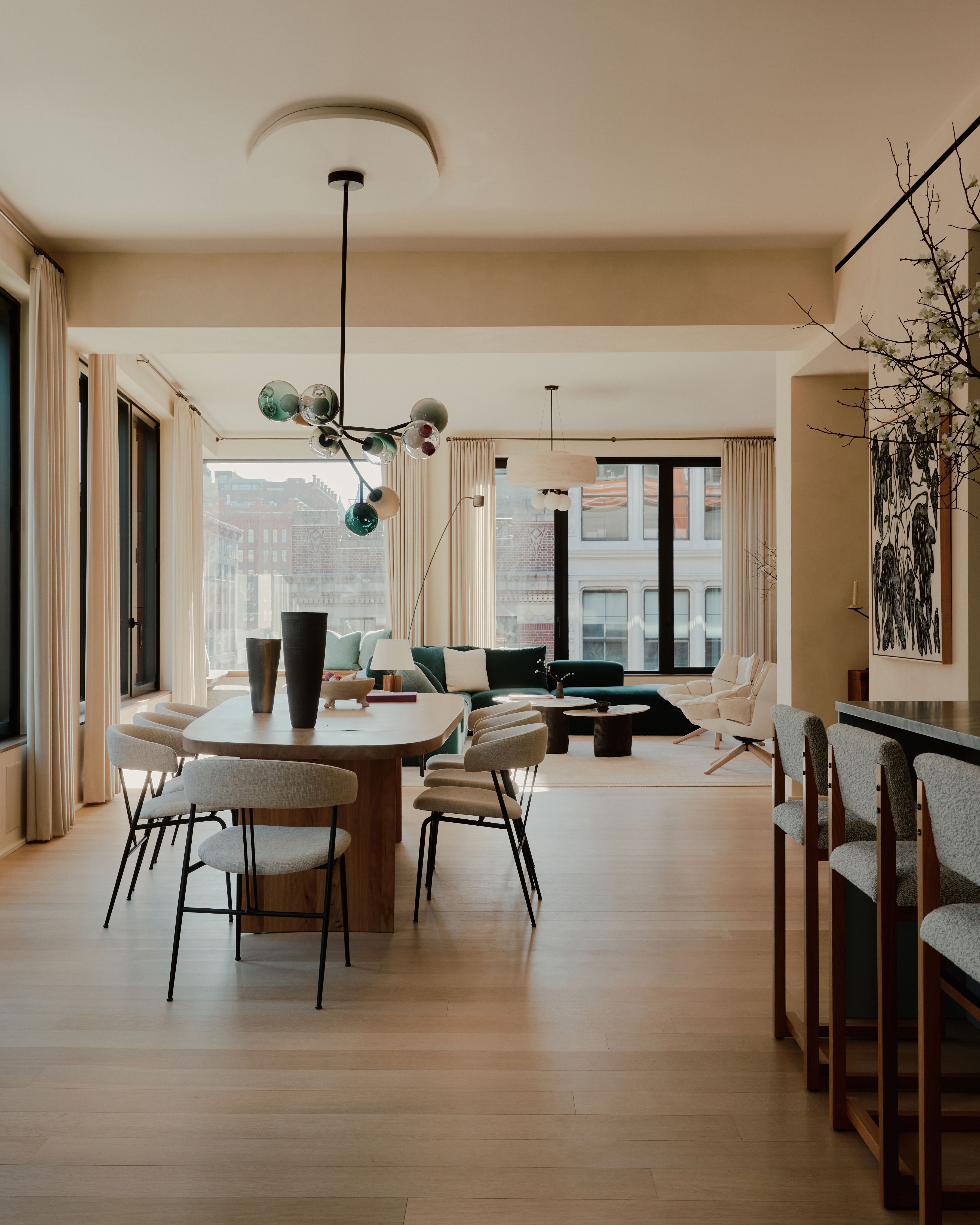 The combination of these subtle textures aimed to evoke a feeling of calm and establish a soft, plush oasis in the heart of New York City. Beaudry Collier successfully navigated the challenge of designing a spatial layout within the expansive, open, and irregular floor plan, ensuring distinct areas for entertaining, dining, and a lounge, despite the absence of dividing walls.