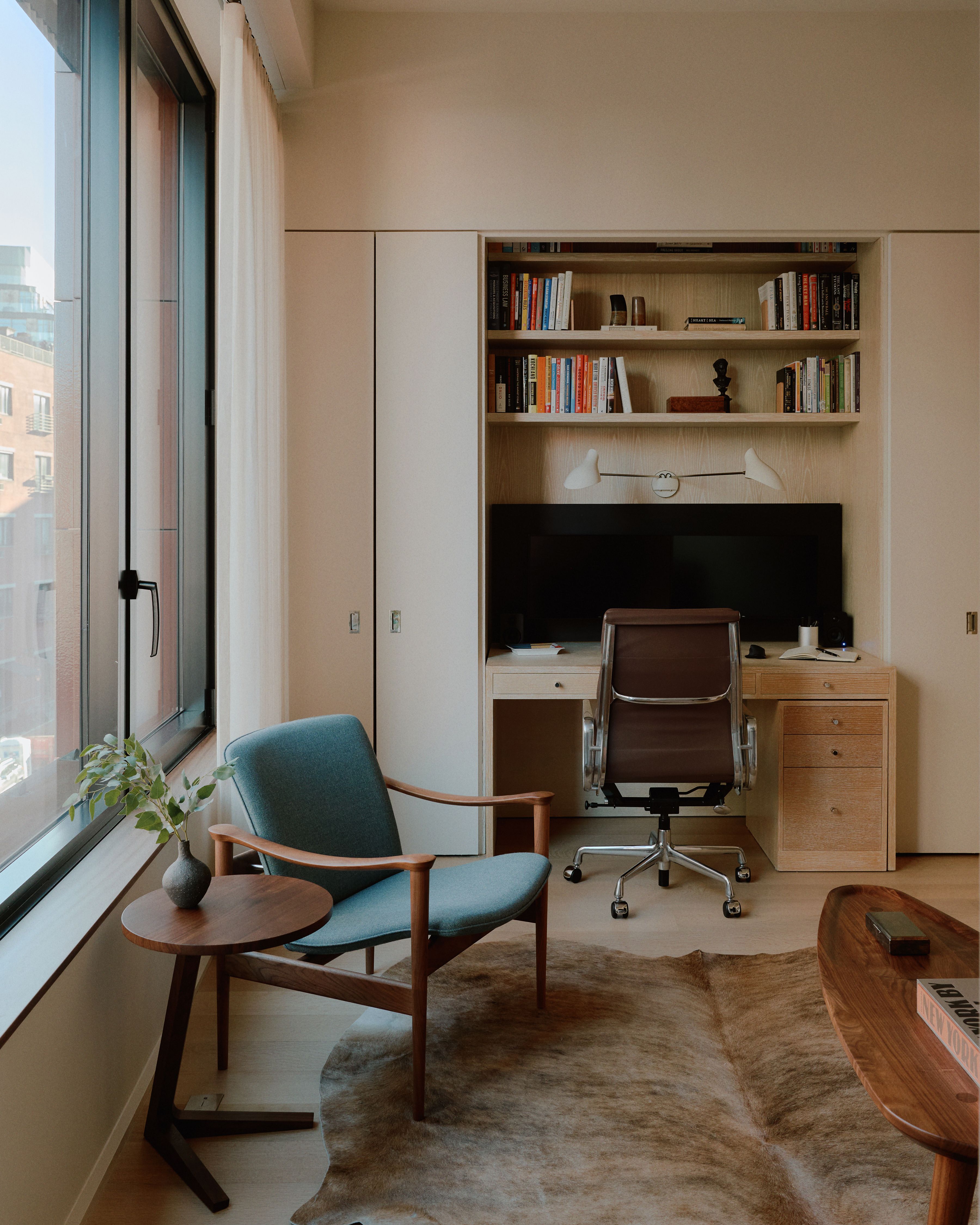 A bespoke dining table was custom designed to harmonize with the angles of the wall, converging gracefully at the built-in window seat that commands a view of the renowned Bond and Lafayette intersection.